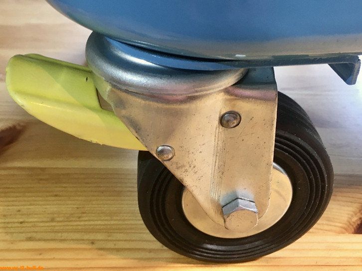 Dieser hier ist mit seinen hellgelb (ca. RAL 1016 Schwefelgelb) lackierten Bremsen an den Lenkrollen ist so bis 1976 in Katalogen zu finden - danach 1979 sind sie unlackiert. Die oberste Etage ist uni-grau (ca. RAL 7001 Silbergrau) lackiert. Der geprägte "Assistent"-Schriftzug ist schwarz lackiert. Die ca. 5.5mm hohen Füllerprofile in den 3 umlaufenden Gummiprofilen sind silbern, aber nicht chromglänzend. Die beiden unteren waren bei meinem aus anderem, starreren Kunststoff-Material als die obere, die bei meinem aus sehr weichem silikonähnlichem Material ist. Die großen Schlitzschrauben und Muttern zum Halten des Fahrwerks an der unteren Wanne sind schwarz brüniert oder chromatiert. Andere Schrauben sind verzinkt. Vollgummireifen sind gekennzeichnet mit "Continental" und "125/40-65", hingegen auf den kleineren 80 mm Lenkrollen findet sich keine Kennzeichnung. Mein Messing-Schloss oben trägt die Nummer "H 236" zu dem ich bisher noch keinen Schlüssel habe und noch suche - habe nur passende Rohlinge bisher.
