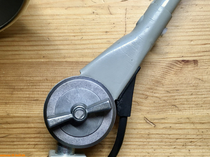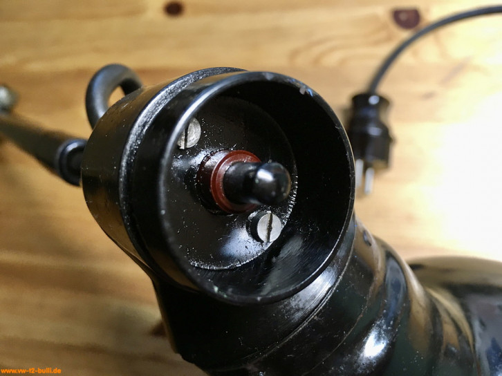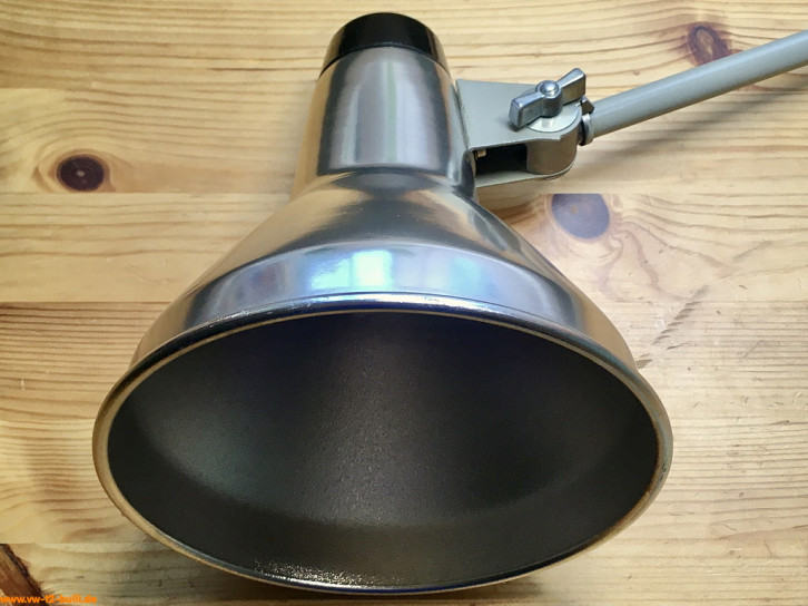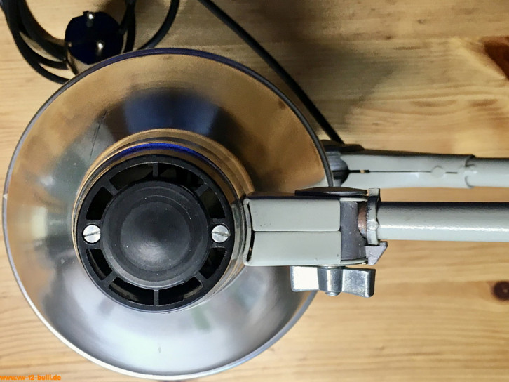 Die modernere Bauform mit Schalter oben (auch unter einer Gummimembran) und Rademacher Produktnummer "163006" gab es ab 1967 als "1615" und verschwand erst nach 2000 wieder aus den HAZET Programm. Ab 1976 wird sie besser in die Nummernkreise passend als "161-5" geführt - ohne Änderung der Leuchte. Der Schirm war zuerst auch außen lackiert. Rademacher änderte die Leuchte über die Jahre zunächst mit unlackiertem, silbernem Schirm innen und später Mitte der '70er auch silbern außen als "163007". Diese hier ist laut dem Aufkleber nach 1987 (Umstellung 220 auf 230 V) bzw. nach 1989 (wegen Nennung IP 20 Schutzklasse / Ingress Protection Einführung für Staub und Feuchte). Die Farbe sonst war und ist nicht identisch mit dem grau beim HAZET Assistent, sondern eher etwas grünlicher und nahe dem RAL 7032 Kieselgrau.