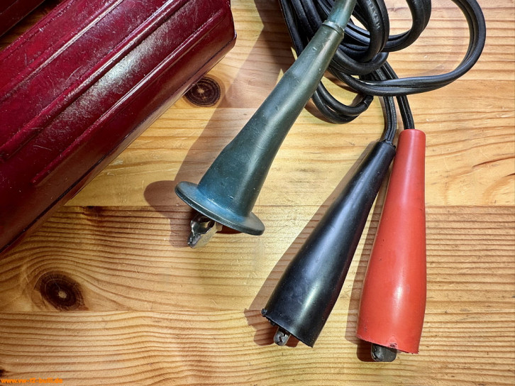 Maße sind 26 x 13 x 12,5 cm (Höhe x Breite x Tiefe) und Gewicht 1,8 kg bzw. mit 2.5 m Kabel 2 kg ohne Batterien. Die Kabelenden werden an zwei Messingpole angeschraubt und haben Kabelklemmen in Gummischutztüllen. Innen sind zwei Batteriefächer - wohl damals für Quecksilber-haltige Zellen, die es heute nicht mehr gibt. Ein größeres für den Drehzahlmesser mit 9 V wahrscheinlich als PP4 (ähnliche Größe wie R20/D/Mono mit nur 1.5 V) und ein kleineres für den Schließwinkel-Tester mit möglichst konstanten 1.35 V als RM12R oder E12N (ähnliche Größe wie R6/AA/Mignon mit 1.5 V). Werde diese Stromversorgung also umrüsten müssen auf modernere Lösungen und ggf. mit einen Festspannungswandler für die 1.35 V.