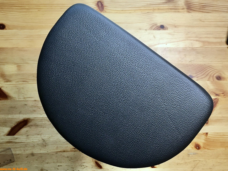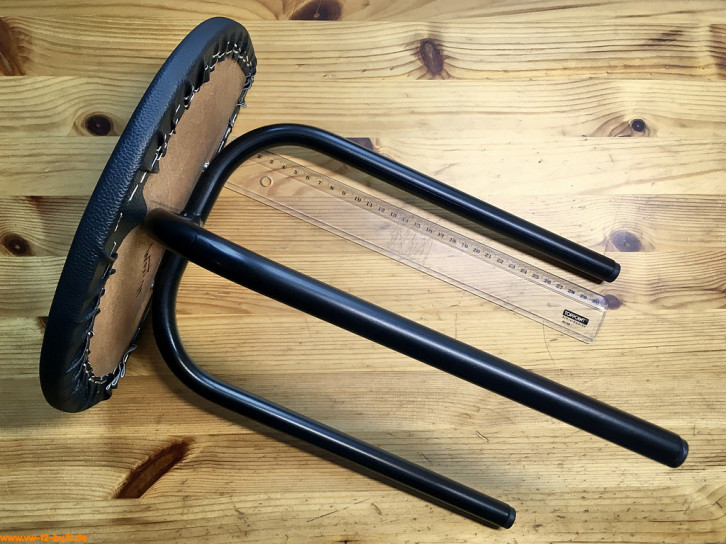 Dieser dreibeinige und nur 320 mm hohe Hocker für Werkzeugwagen "161", "162" und "166 TS" konnte an deren Unterkasten mit einem Bein eingeschoben werden wobei die anderen beiden unter dem Wagen hingen. Für alle Arbeiten z.B. im Heckmotor, die der Monteur besser im Sitzen ausführt. Er besteht aus einem schwarz lackiertem Stahlrohrdreibein und einer mit schwarzem Kunstleder gepolsterten Sitzfläche aus Holz.