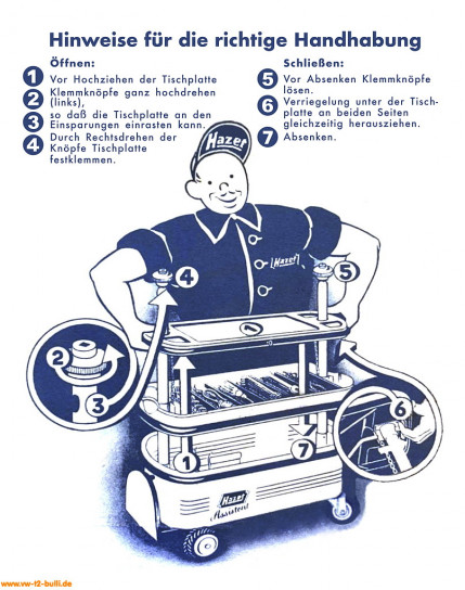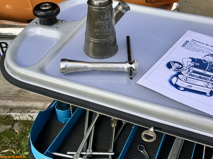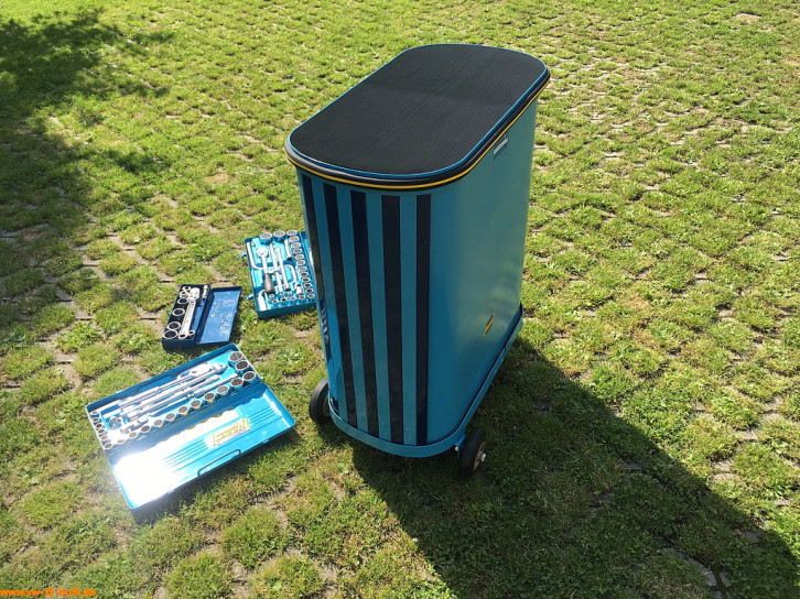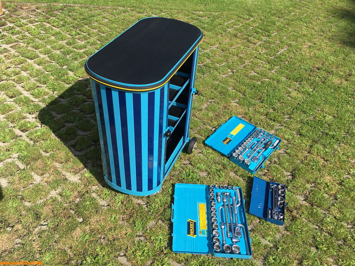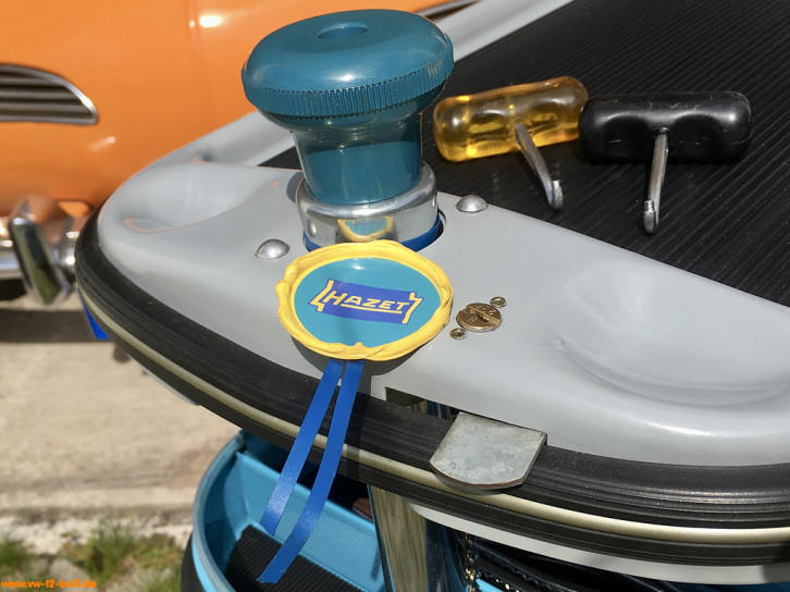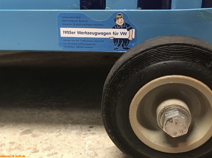 Diesen Werkzeugwagen mit einer Höhe von 86 cm, 68 cm Breite, 38 cm Tiefe und ca. 31 kg schwer gab es nicht im Handel und wurde von HAZET wohl nur an (wenige) Volkswagen Werkstätten verkauft. Eine HAZET Nummer hat er nicht. Er ist Teil der "HAZET Assistent" Geschichte ab 1954 und so etwas wie der Vorläufer des HAZET "Assistent 172 HD" ab 1967 bzw. "168" ab Ende der 80er. Man findet ihn mehrfach aber selten um Remscheid - ich kenne aus dem Internet so knapp 50 Stück von Belgien bis Hannover. Meist in den HAZET Farben hell- und dunkelblau. Einige wenige aber in rötlich und blau damals angeblich für die Firma "DuPont". Bei theSamba.com nannte ihn jemand treffend "Popcorn" passend zur Streifenoptik.