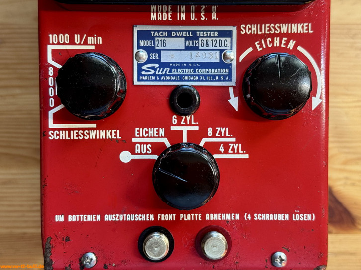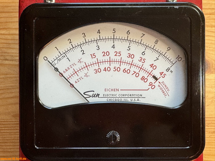 Laut Sun Prospekt 1961: "Dieser kombinierte elektrische Drehzahl- und Schließwinkelmesser misst per Schalter entweder die Motordrehzahl oder den Schließwinkel für die Zündung. Zwei Skalenbereiche ermöglichen die Anzeige von 4-, 6- und 8-Zylinder-Motoren".