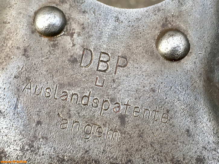 Neben dem aufgesetzten "Hazet" Blech-Logos und eingeprägtem "Assistent" an den Seiten findet sich oben noch nach den Säulen auf der Tischplatte die Inschriften "DBP u Auslandspatente angem" für "Deutsches Bundespatent" und "Auslandspatente angemeldet". Desweiteren eine "92" und ein unbekanntes Zeichen wie ein Haken ähnlich einer 4 oder die Seitenfalken des Hazet-Logos.