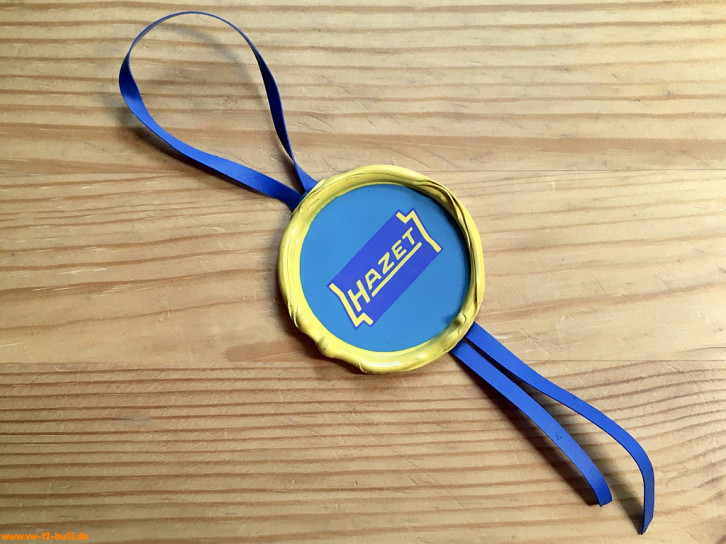 Dies ist einem Wachssiegel nachempfundene Anhänger aus gelben Kunststoff mit blauen Band und "HAZET" Logo. Durchmesser ist ca. 50 mm, Länge über alles der Bänder ca. 160 mm, Stärke am Rand bis ca. 4 mm. Der Anhänger wurde um 1976 (siehe Prospektbilder) an den Säulen der HAZET Assistenten verwendet. Warum ist bisher unbekannt.
