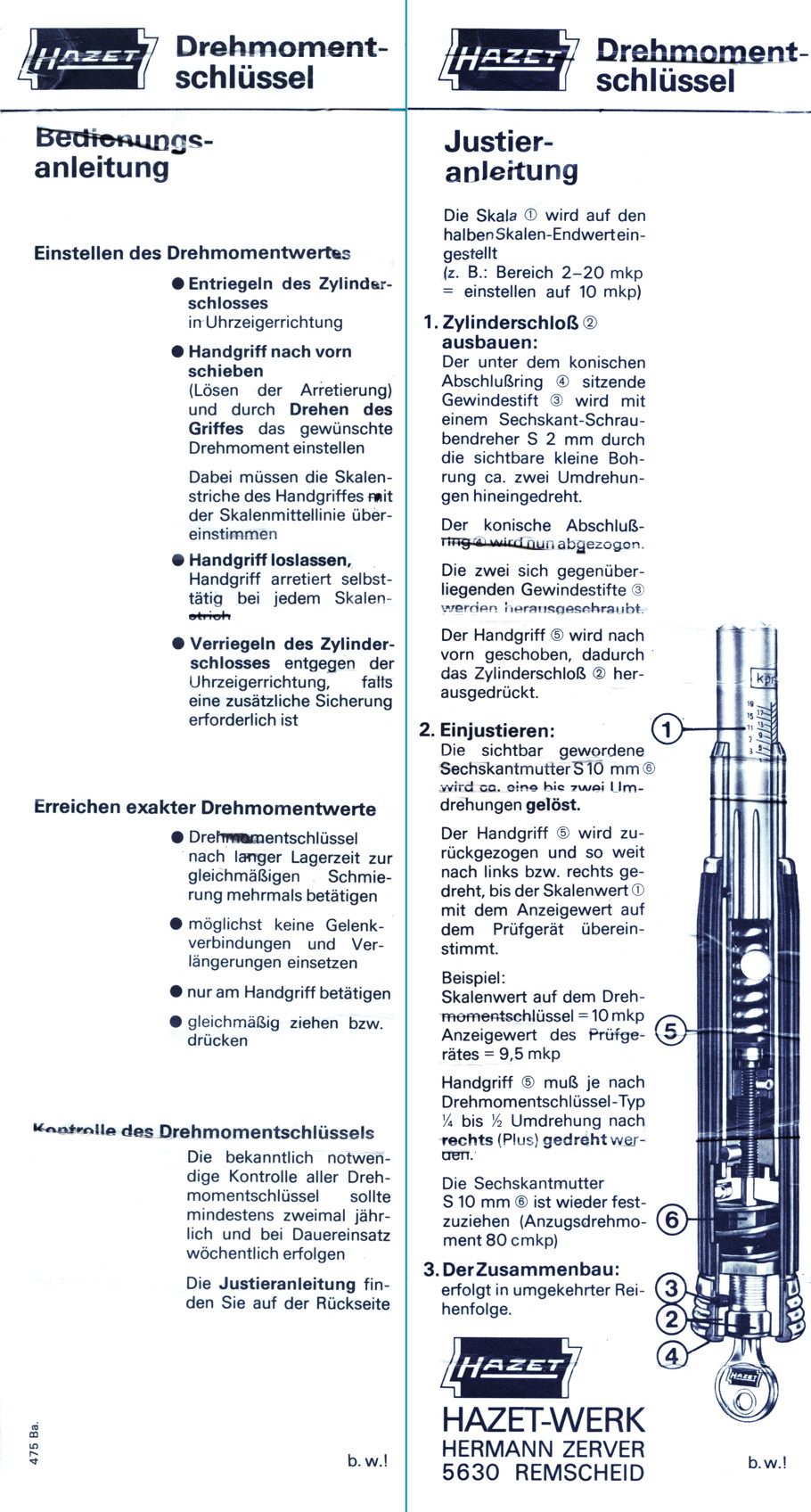 - 1976 HAZET Drehmomentschlüssel, Bedienungsanleitung & Justieranleitung
