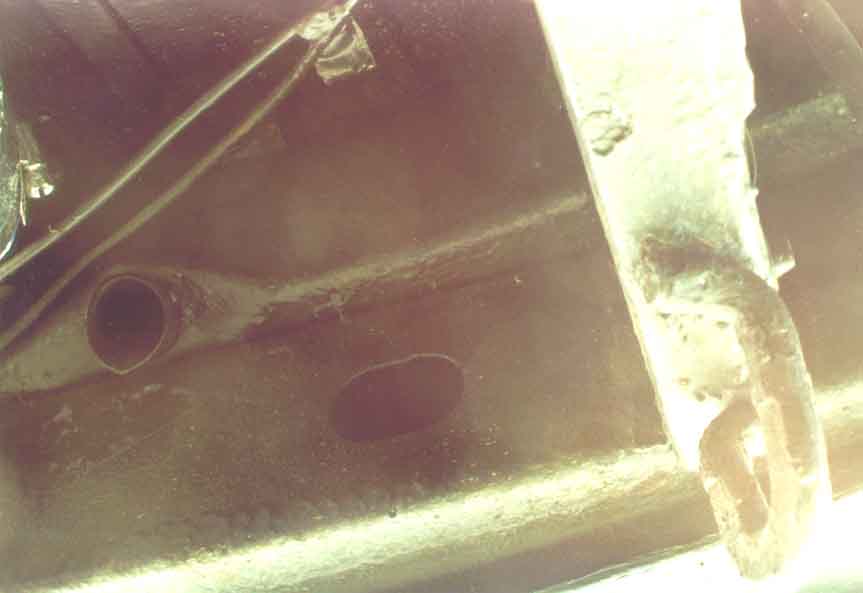Die Öffnungen im ersten Querträger direkt hinter dem Deformationselement (Abschlußträger vorn), normalerweise durch die