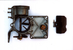 rechts die Schwimmerkammer mit der Beschleunigungspumpe,