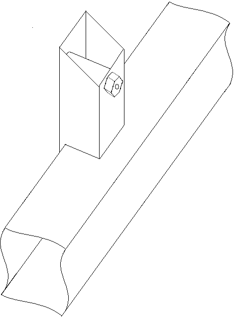 Diese Zeichnung zeigt einen senkrechten Schnitt der linken Seite. Man erkennt den Längsträger, die eigentliche Halterung, den eingesetzten Bolzen und hinten die Mutter. Rechts oben ist der Tankraumboden angedeutet. (Man erkennt hier auch, daß zu lange Stoßdämpferschrauben den Tank zerstören können!)